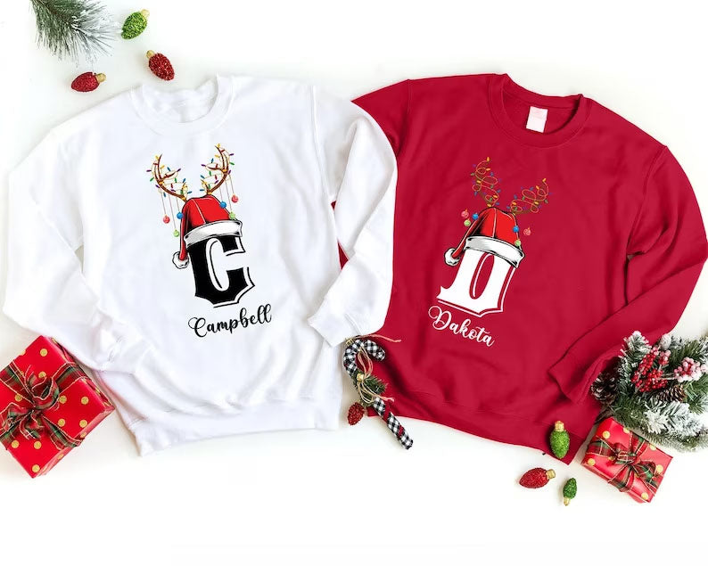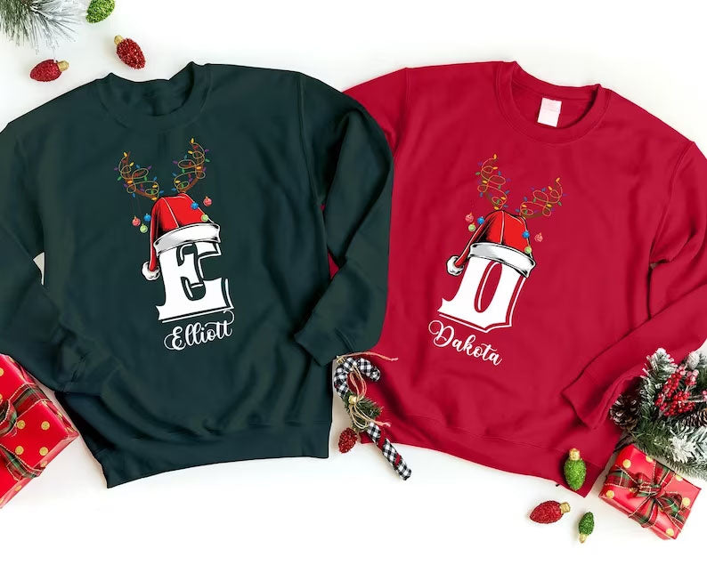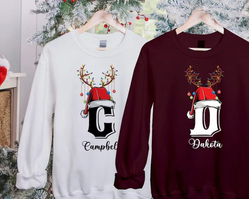 Christmas Reindeer Horns Sweatshirt, Custom Name With Initials Printed Sweater, Personalised Family Pullover Jumper, Christmas Eve Party Top
