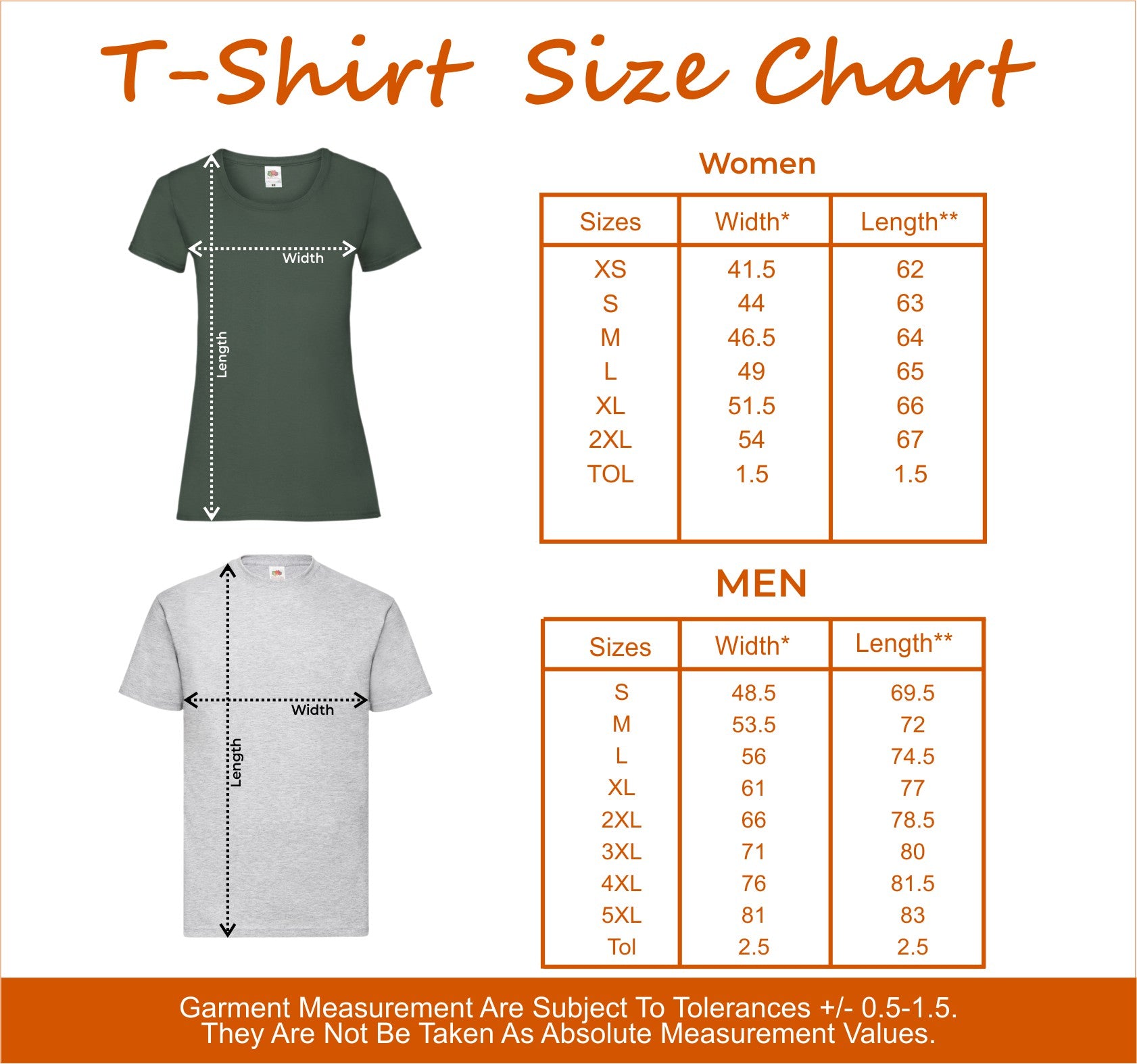 Garment Measurement is subject to tolerances which are +/-0.5-1.5 Inches. They are not be taken as absolute measurement values. When a garment is measured, the values may vary and can be above, below or the same as the values stated.