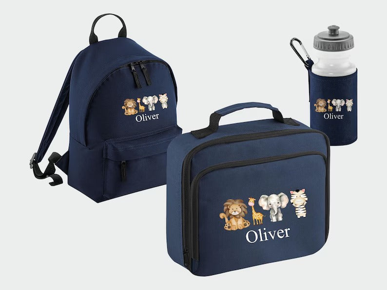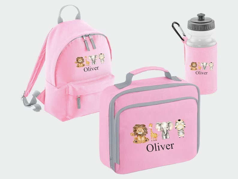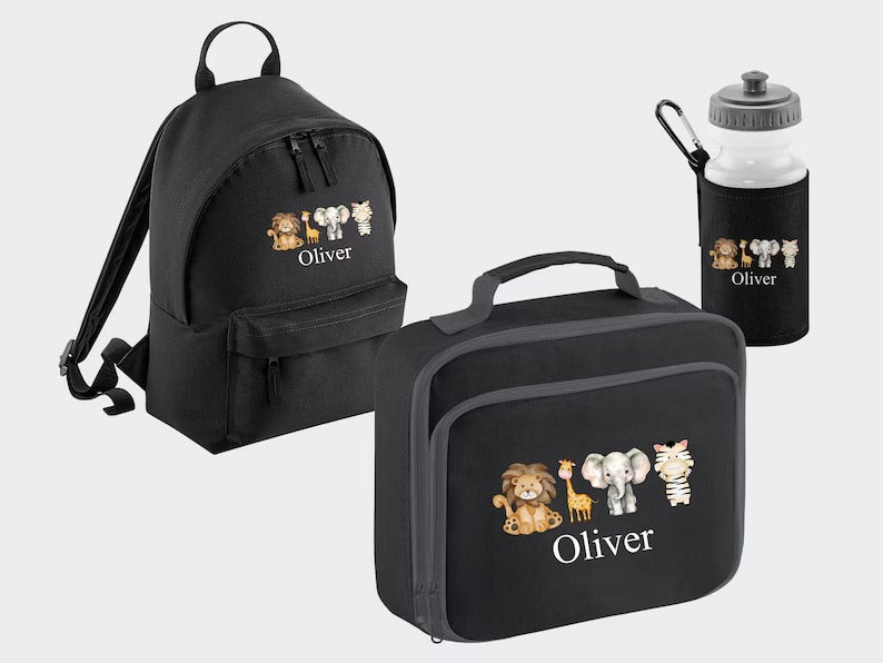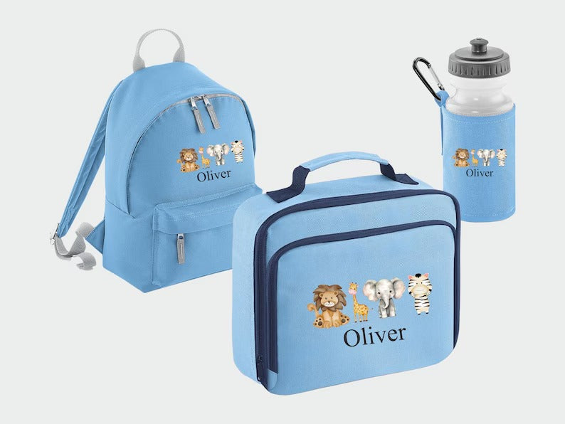 Custom Kids Name Safari Backpack Set, Zoo Animals Back to School Bags, Lunch Bag Water Bottle and Bag, Personalised School Children Gifts