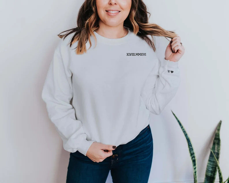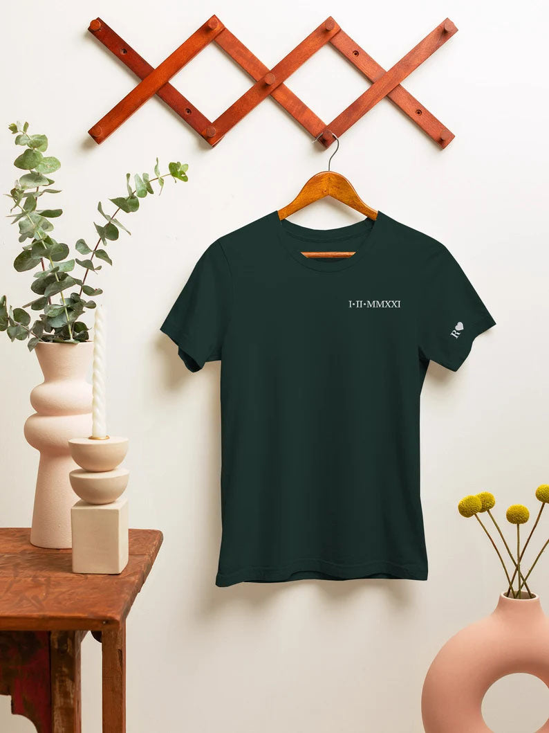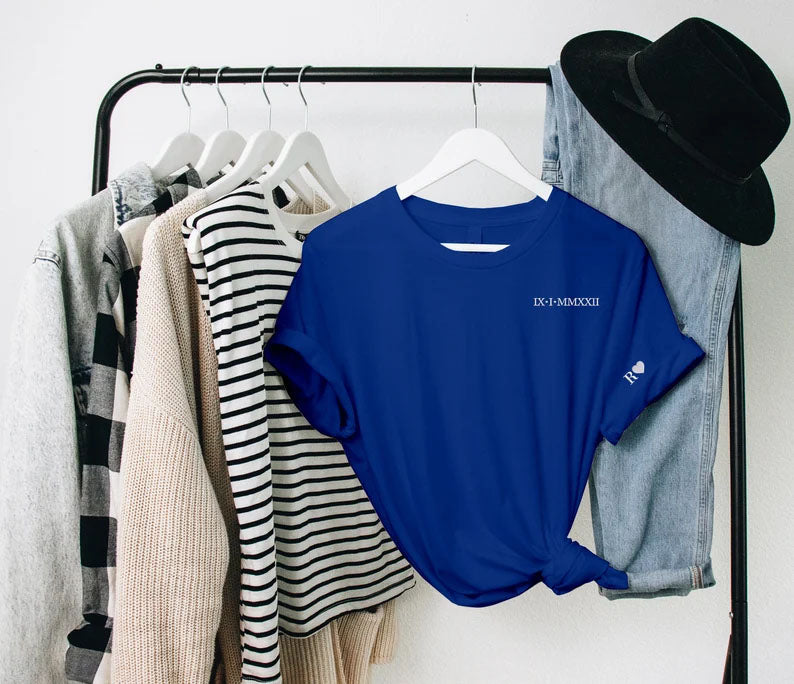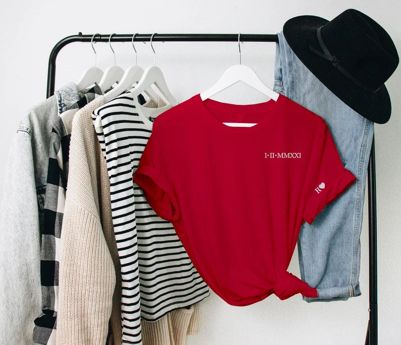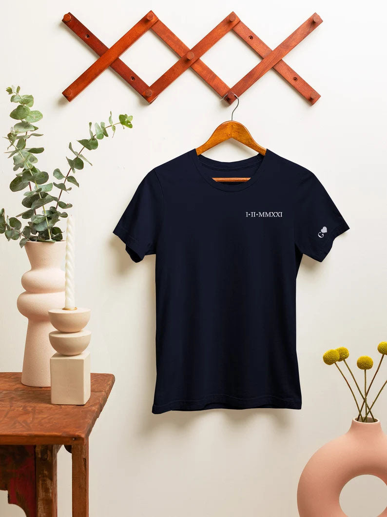 Custom Special Date Anniversary T Shirt, Roman Numeral Embroidered T Shirt, Personalised One Year Dating Gift For Couple Off White Tee Shirt