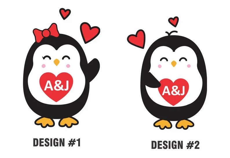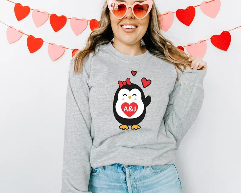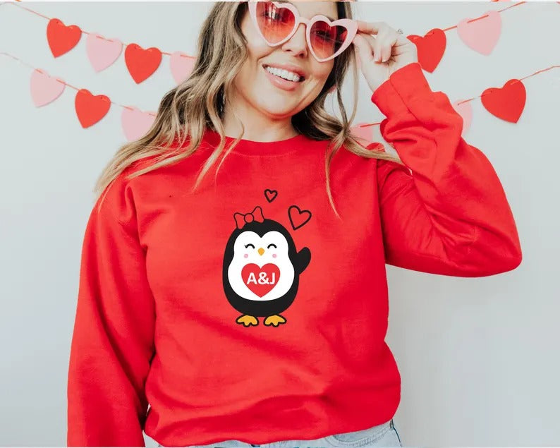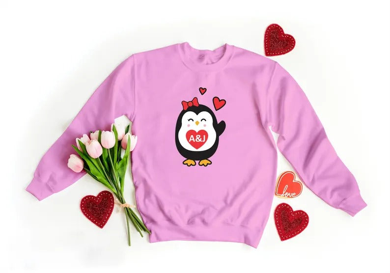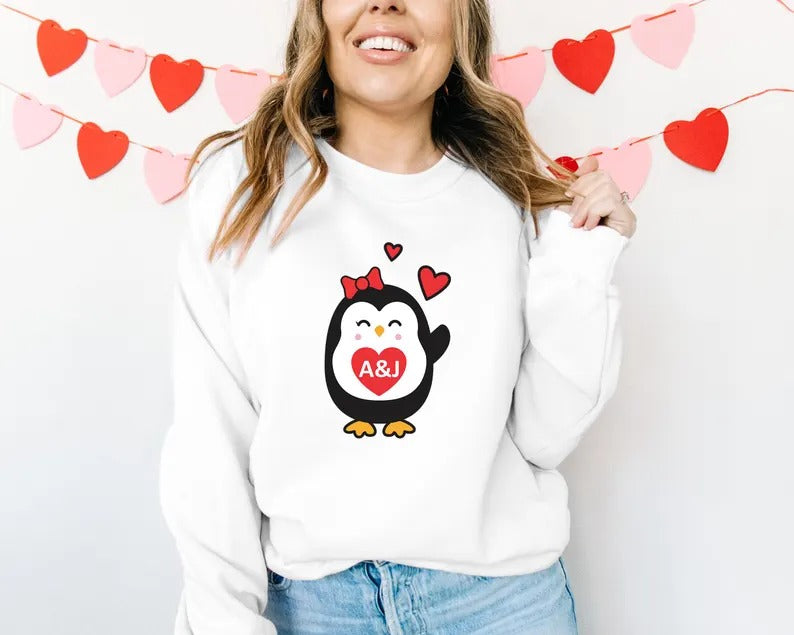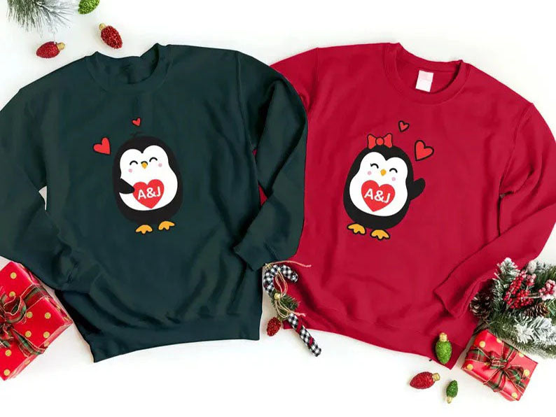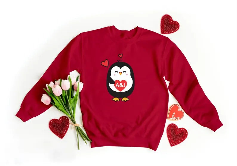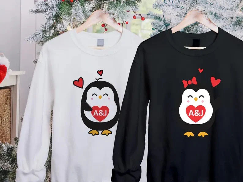Cute Penguin Christmas Sweatshirt, Personalised Couple Initials Xmas Sweater, Christmas Animal Matching Jumper, Xmas Penguin Lovers Gifts