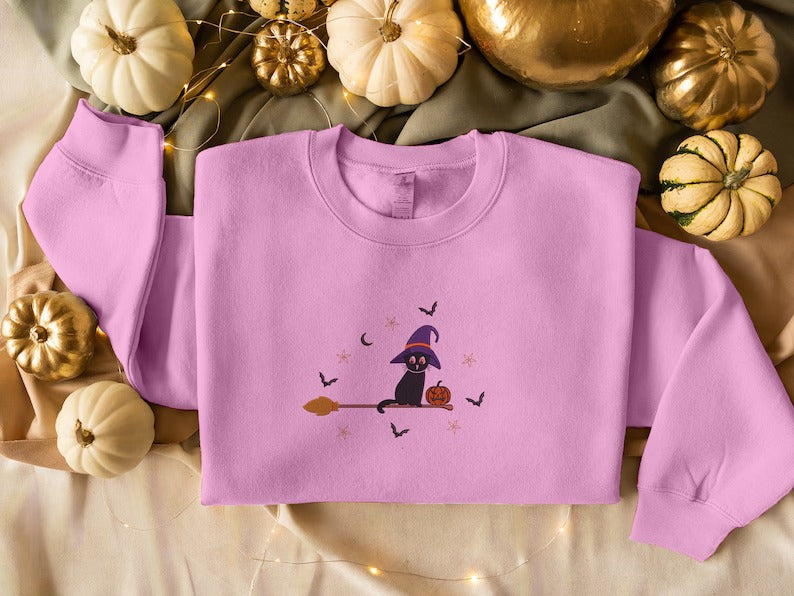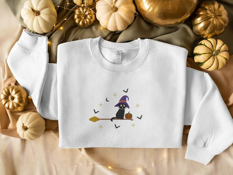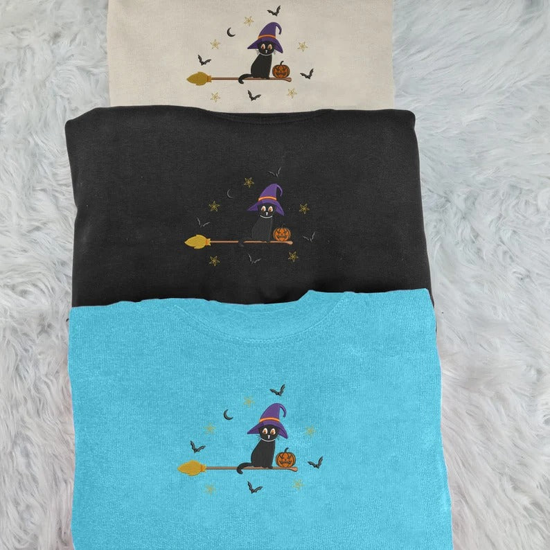 Embroidered Cat Witch Sweatshirt, Halloween Black Cat Sweatshirt