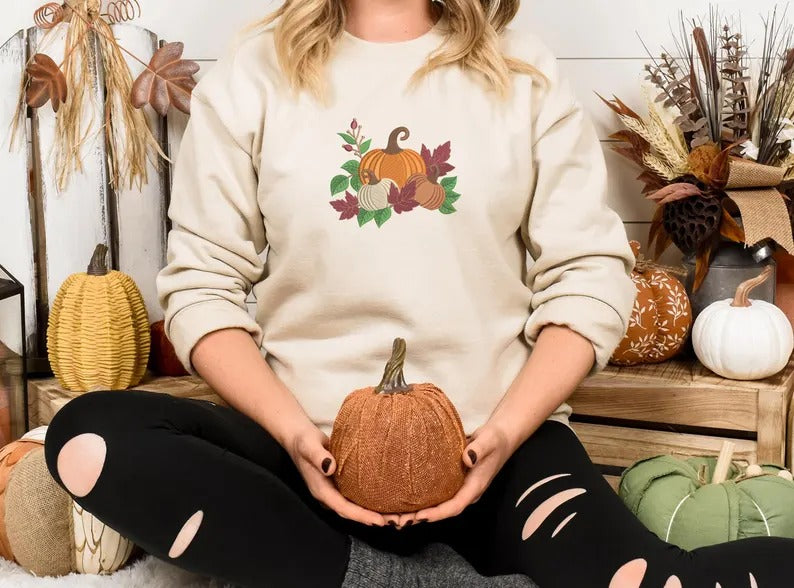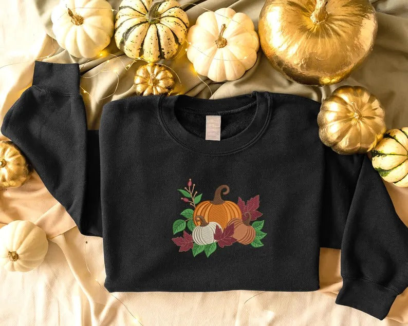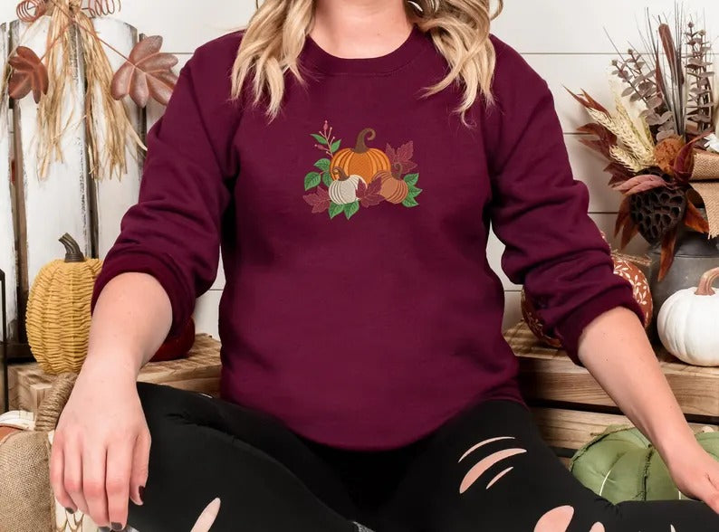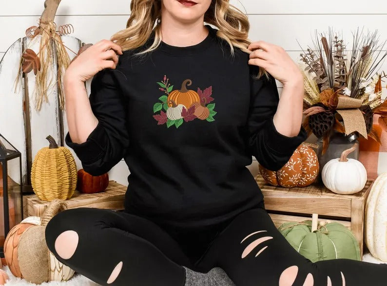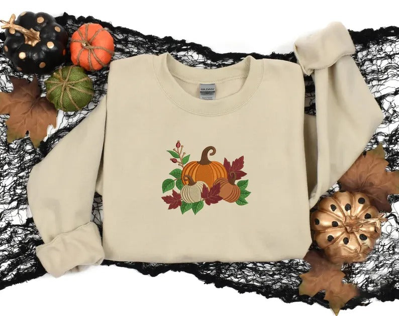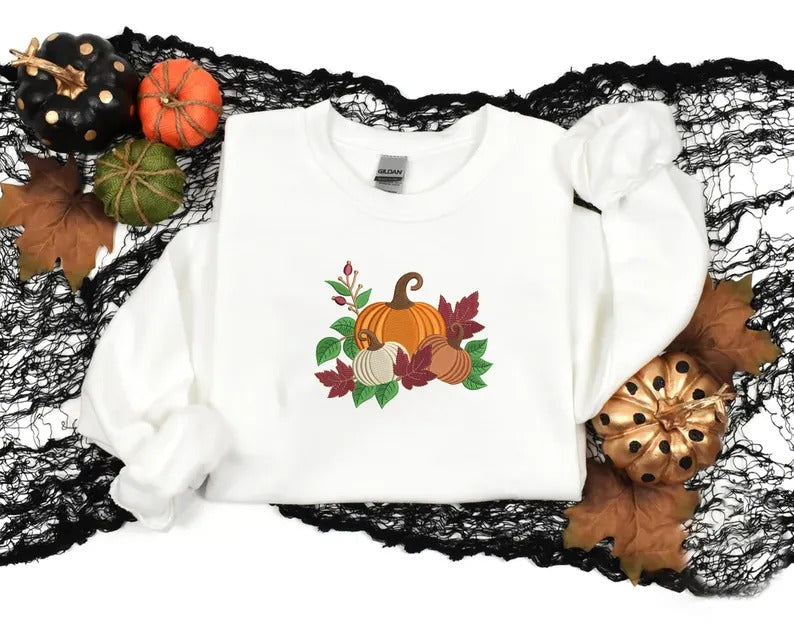 Fall Halloween Embroidered Sweatshirt, Autumn Leaves Crewneck Sweatshirt