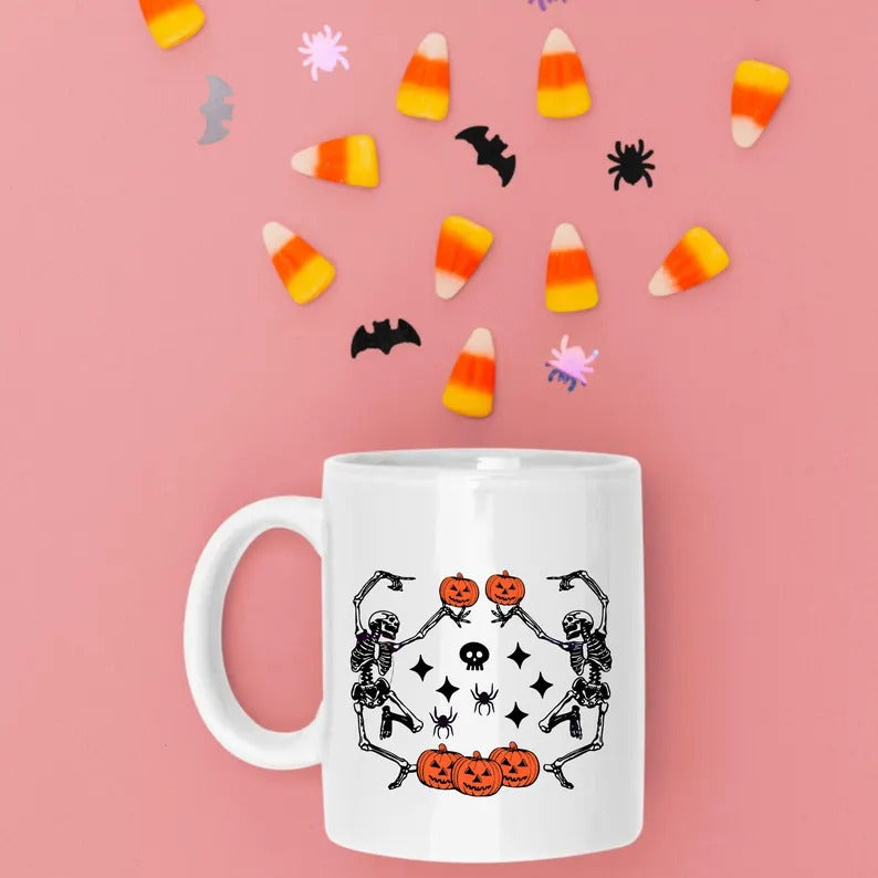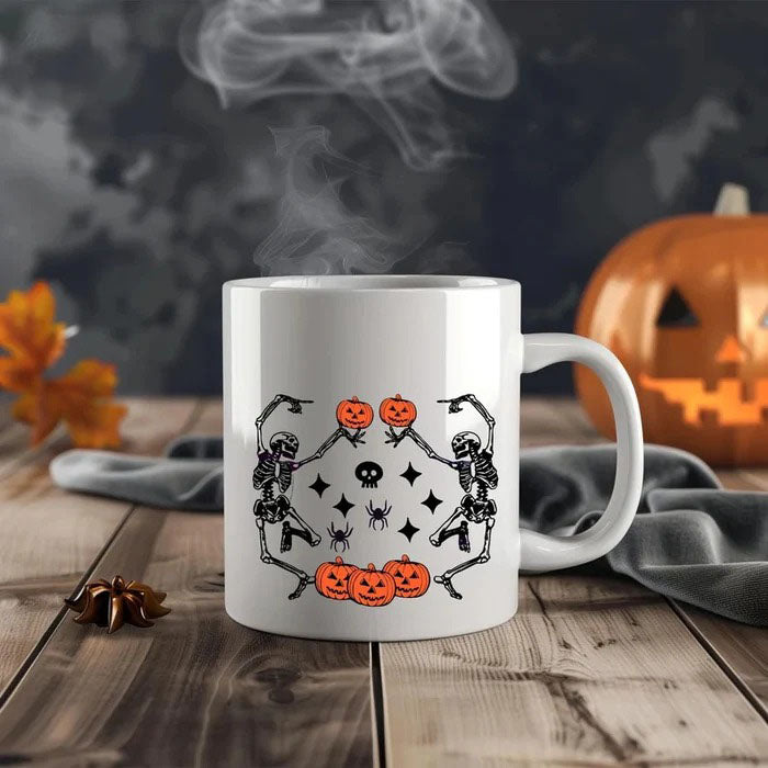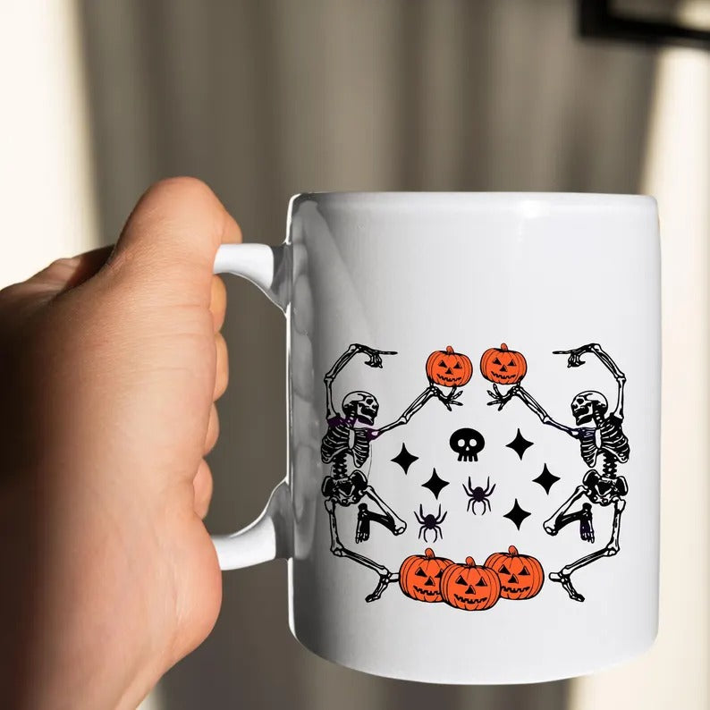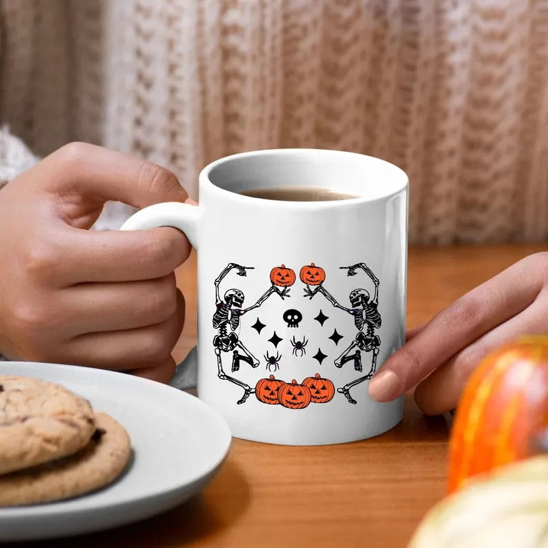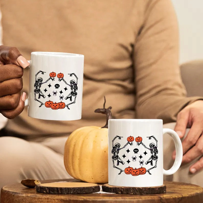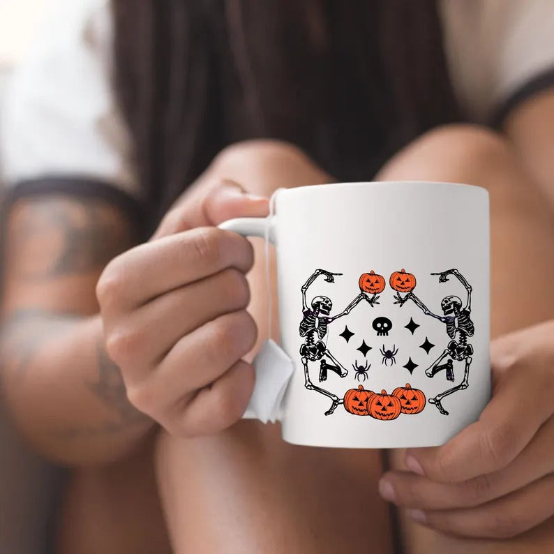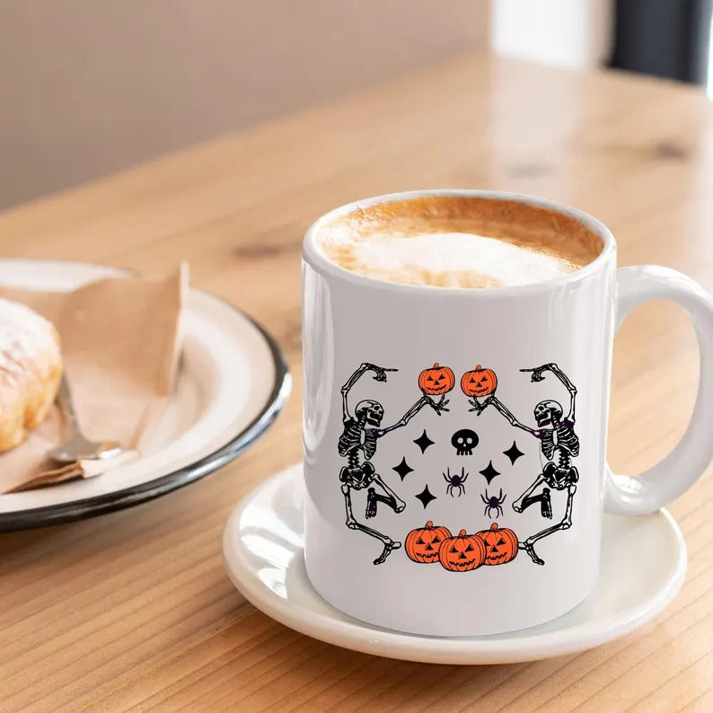 Funny Dancing Skeleton Coffee Mug, Retro Halloween Printed Mug, Vintage Fall Pumpkins Ceramic Mug, Spooky Season Cup, Fall Gift for Friends