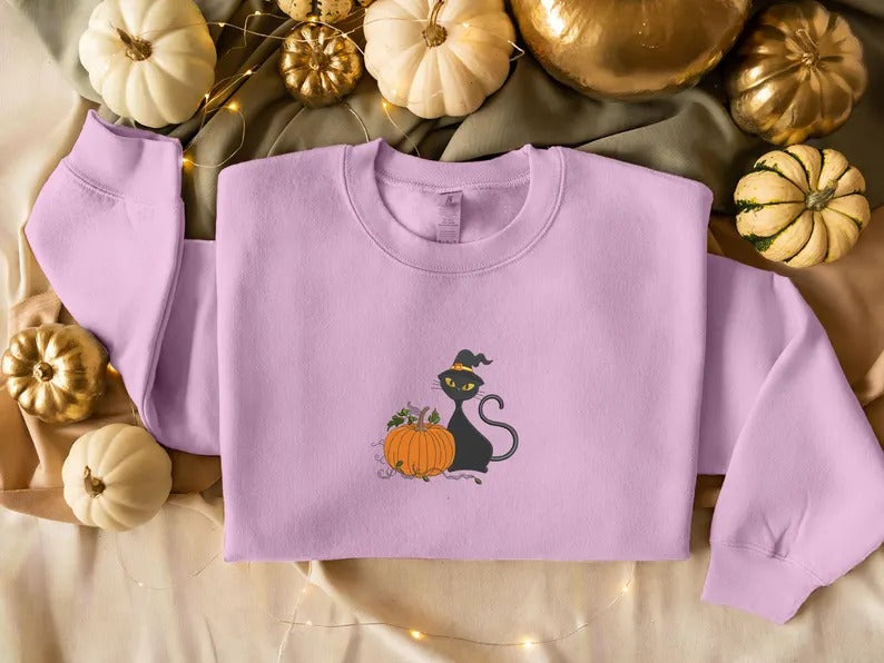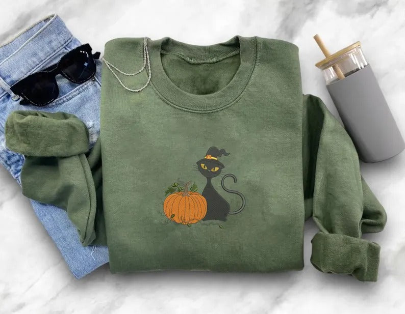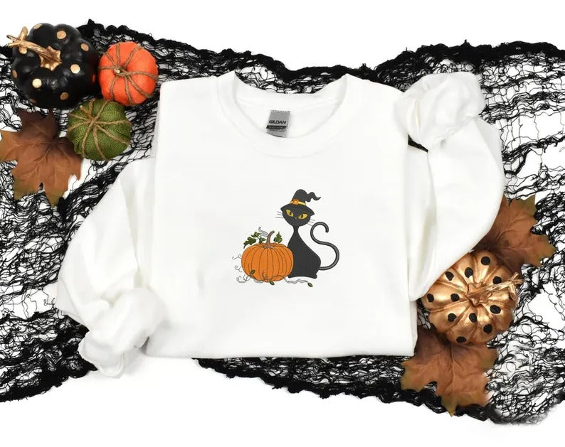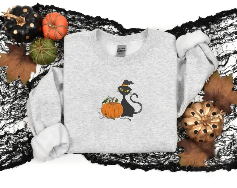 Halloween Witch Cat Embroidered Sweater, Halloween Witchy Cat Jumpers
