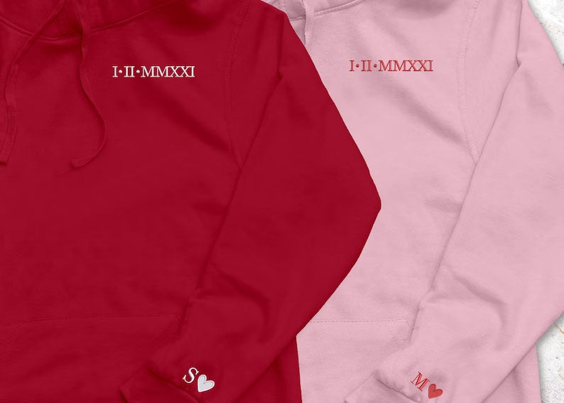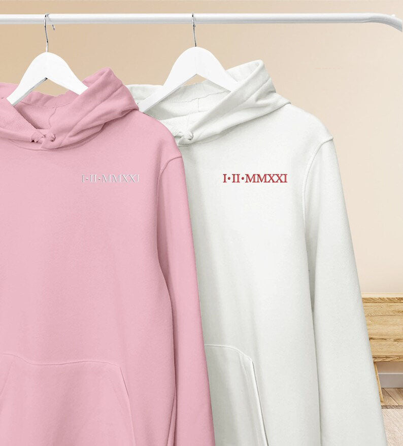 Roman Numeral Hoodie, Embroidered Hoodie, GF BF Couple Matching Sweater, Cotton Anniversary Wedding Special Date Roman Numeral Wifey Jumper